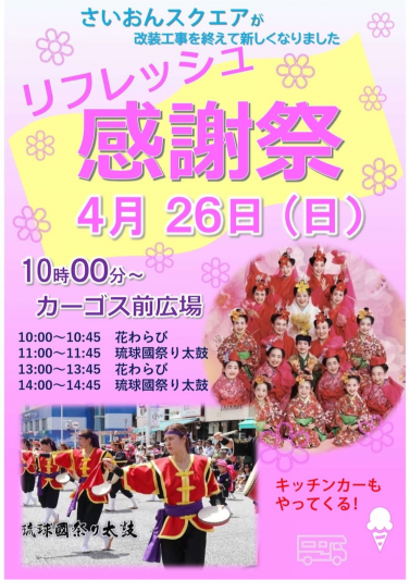 「リフレッシュ感謝祭」が、さいおんスクエアのカーゴス前広場にて開催。